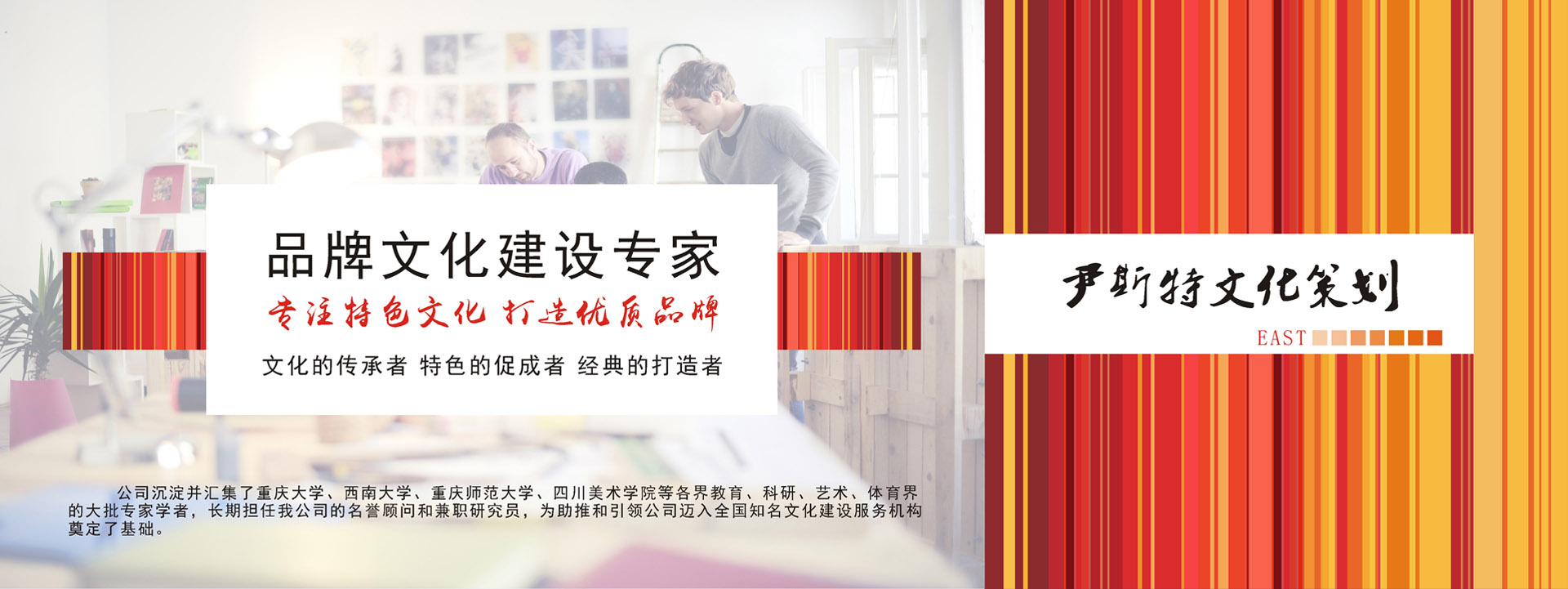 重慶尹斯特文化傳播有限公司全體同仁堅守“文化的傳承者,特色的促成者,名企的打造者”的服務(wù)宗旨,齊心協(xié)力,不斷進取,攜手為西部乃至全國的企業(yè)策劃和企業(yè)文化建設(shè)事業(yè)作出新的貢獻。